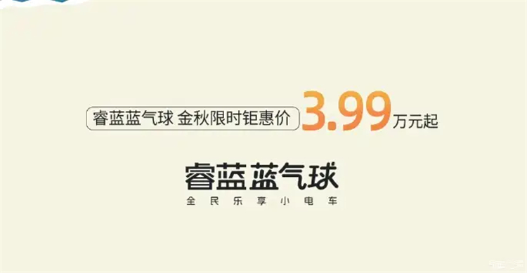从睿蓝汽车官方获悉,旗下睿蓝蓝气球推出金秋限时钜惠价3.99万元起。蓝气球定位微型纯电动车,目前共有2款在售车型,售价分别为4.69万元与5.09万元。蓝气球整个外观造型呈现“可爱风”,内部采用2+2座空间布局,动力上配备后置单电机,续航里程可达210公里。