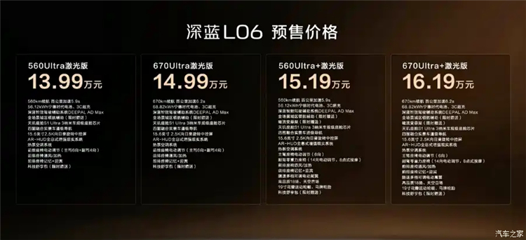 深蓝汽车官方宣布,旗下深蓝L06正式开启预售,共推出4款车型,预售价区间为13.99-16.19万元。深蓝L06定位中型车,外观上采用深蓝品牌的家族式设计理念,配置上将标配激光雷达,同时还拥有例如3NM车规级座舱芯片、磁流变悬架等高端配置,并采用纯电动力系统,最大续航里程为670公里。据悉,新车将于四季度内正式上市。
