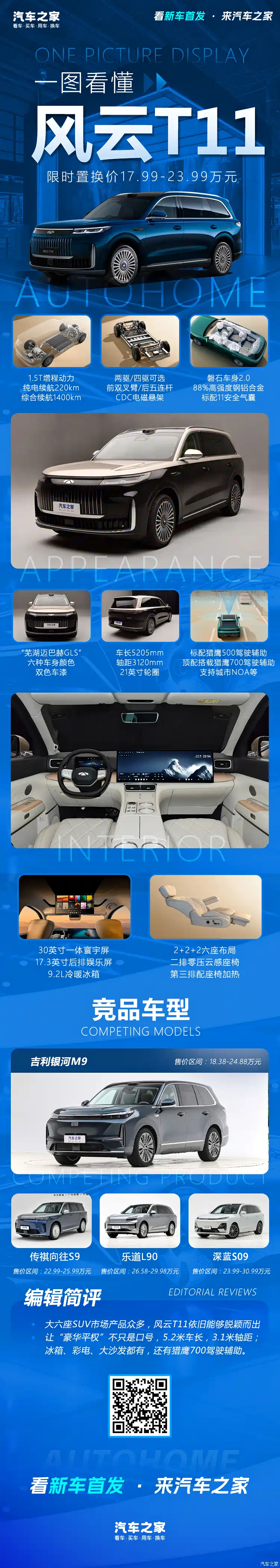 奇瑞风云T11正式上市,新车共计推出4款车型,售价18.99-24.99万元,限时置换价17.99-23.99万元。奇瑞风云T11定位为一款6座大型SUV,采用增程式动力,是风云品牌的旗舰级SUV,CLTC纯电续航220km,CLTC综合续航1400km。